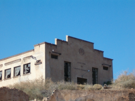 Tras pasar entre dos pequeñas edificacione que dan entrada al complejo, el trazado deja el desagüe a la izquierda, con la enorme nave y la chimenea de las antiguas calderas. El estado es ruinoso, y resulta arriesgado adentrarse en la nave de la estación de transformación. Desde fuera se aprecia la fachada, con un escudo en el que se distinguen las siglas M.A.S.A., enlazando con la última época de actividad minera, que estudiamos a continuación.