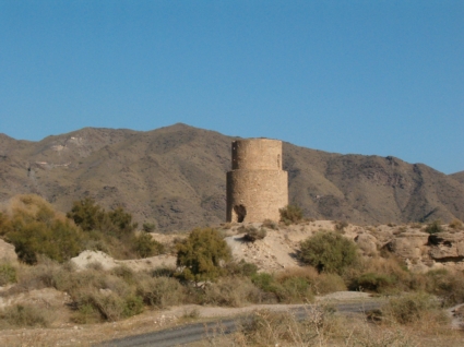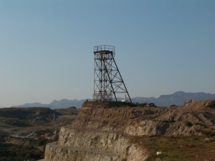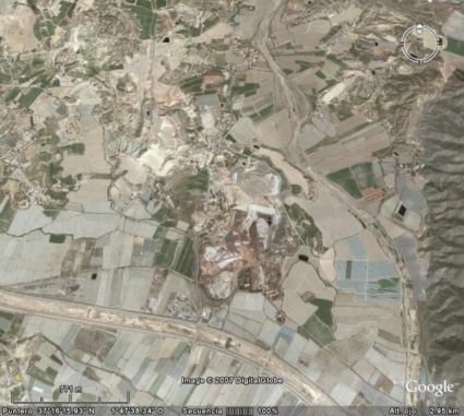 Vista en Google Earth de Las Herrerías. A la derecha, Sierra Almagrera, al sur el río Almanzora.Castillete de la Mina Diana, a la entrada de Las Herrerías