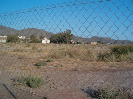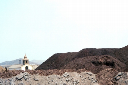 Una vez rodeado el pueblo por el lado del río, tomamos un carril a la izquierda de tierra rojiza. Un cartel nos prohibe el paso avisando de estar en zona minera. Sin embargo, como ya se dijo antes, la explotación está abandonada. Paramos en el cruce y miramos a la llanura blanquecina de la derecha, rodeada por una valla metálica. Ahí yace, sepultada por los escombros extraidos por Minersa desde finales de los años noventa, la antigua, gigantesca y mítica Roza de Santa Matilde. Una pena. Mientras en Río Tinto se venera la Corta Atalaya y se le saca todo el partido turístico e interpretativo, aquí se destroza sin rubor el patrimonio geominero, con la anuencia de las distintas Administraciones.