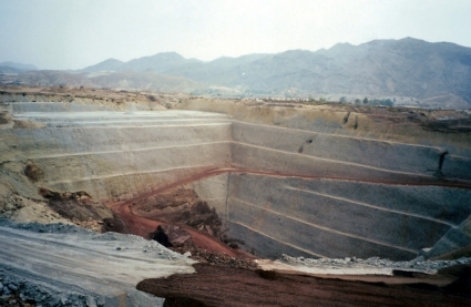 Si continuamos por el camino llegamos a la nueva roza de Minersa. Su aspecto es imponente, pero como se deduce observando Google Earth, resulta pequeña comparada con el perímetro aún apreciable de la antigua. En un primer momento, una vez extraídos los estériles, (nótense las paredes de color claro) y vertidos estos en la Roza de Santa Matilde, se explotó la barita a cielo abierto. Después, el plan de labores contemplaba su explotación por minería subterránea, por el sistema de cámaras y pilares en método de retirada, lo que permite el almacenamiento de estériles en el interior de la mina y con ello la no creación de escombreras, así como evitar posibles problemas de subsidencia o hundimientos.